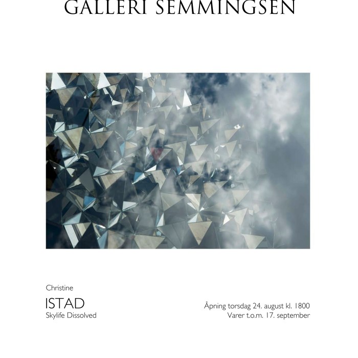 SKYLIFE DISSOLVED Galleri Semmingsen Fru Kroghs brygge 2, Tjuvholmen, 0252 Oslo Christine Istad Åpning torsdag 24/8 kl 18.00. Utstillingen står til 17/9 2017 Kunsthistoriker Benedicte Sunde holder åpningstale. Gjennom fotografiske nærstudier av høyreist arkitektur og kompakt urbanitet bruker hun kameraet som forstørrelsesglass for å fremheve […]
